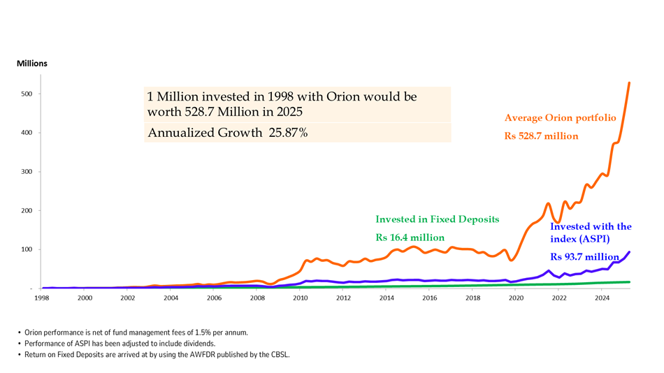 The graph shown below vividly discloses the growth an investor would have achieved if a sum of LKR 1 Million in January 1998.